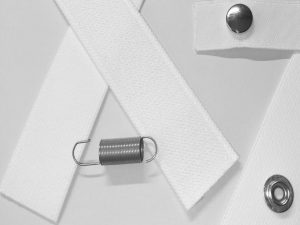 Auch mit Ösen für die Befestigung von Federn, O-Ringe. Ebenso verpressen wir die elastischen Gewebestreifen direkt am Gurtmaterial.